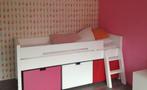 Stevig bed van bopita. Met lattenbodem, trapje, bedrand en 3 opbergboxen op wieltjes. Inclusief matras 90x200. Vertoont hier en da