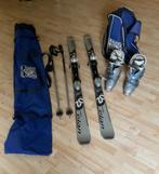 Complete ski-uitrusting bestaande uit carve ski’s 150 cm + salomon ski-schoenen maat 39 + ski-stokken 115 cm + draagtas skischoenen + draagtas ski’s en stokken.