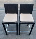 Twee barkrukken in rotan, donkerbruin, incl kussens.