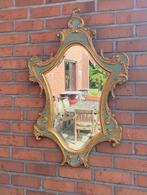Spiegel in rococo stijl in verguld hout en vermoedelijk gesso met groene accenten, versierd met gestileerde bladfriezen uit de 19e eeuw. Dit is een enorm sierlijke spiegel met decoratieve rand in een