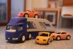 Little tikes vrachtwagen, auto transporter, kan zowel binnen als buiten. Kindjes kunnen er ook op gaan zitten. Heel robuust. Gebruikt maar goede staat. Drie auto’s. Eén auto extra, die wel wat is afge