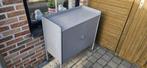 Stevig metalen tuinkast met deurtjes. Afmeting: breed 77cm diep 36cm hoogte inclusief poten 82cm hoogte kastje met deuren 56cm vo