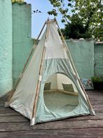 Handgemaakte unieke, zeshoekige speeltent met uitneembare speelmat, vervaardigd uit natuurlijke materialen: baalkatoen, tentkatoen en hazelaar stokken. Nieuwprijs €270. Te koop voor €150 reg