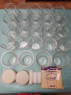 Totaal 24 stuks stevige vintage confituurglazen in goede staat waaronder 4 confituurglazen weck. 593Gr. Herbruikbare parafinnewas. 61 Cellophaneblaadjes van imperial. Alles vintage om zelfgemaakte con