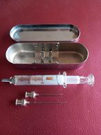 Ancien étui d'injection avec seringue en verre plein de 1 ml + aiguille eet (complète). Seringue de type record avec tige en verre dépoli, piston en verre et lame en verre. Stérilisation à des tem