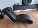 Ligfauteuil in materiaal type kunstleder. Zwarte kleur. Met hoofdkussentje dat vasthangt aan de fauteuil met twee lussen, kan ook naar achteren geflapt worden. Lage pootjes, chroomkleur achteraan, zwa