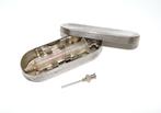 Wwii us medic seringue + aiguille dans sa boîte en métal originale, un seringue en verre, elle est maintenue par un support en métal + aiguille. Faire offre! Voir mes autres pièces militaria en vente: