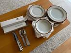 Service en porcelaine de limoges. 10 Grandes assiettes, 10 assiettes à entrée, 10 assiettes à soupe. Boites de six couteaux, fourchettes et cuillères à soupe. Jamais utilisé ni lavé en machine.