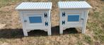 Twee stevige eiken kasten die een complete make-over hebben gekregen. De kasten zijn geschuurd, opgeknapt en met zorg opnieuw geverfd in een frisse wit-blauwe combinatie. De blauwe details, speelse sc