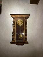 Werkt nog goed en is junghans van merk. De maten zijn 57,5cm hoogte, 35,5 cm breedte en 16cm dikte van de muur.opwindsleutel is er