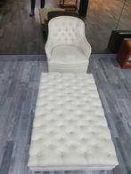 Stijlvolle, crèmekleurige fauteuil met bijpassende grote gecapitonneerde ottoman. Comfortabel, klassiek design en nog in goede staat (vlek op fauteuil). Perfect als lounge- of leeshoek.