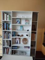Bibliothèque en bois blanc avec partie centrale coulissante. Etagères supplémentaires fournies. Dimension totale : hauteur : 181 cm, largeur : 117 cm, profondeur : 26 cm dimension de la partie couliss