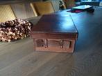 Een decoratieve opberg box van bruin imitatieleer. Gebruikt maar nog heel netjes binnenin . 35 X 23 cm langs beide kanten handgree