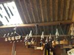 3 oude lusters, eikenhout en smeedwerk eraan. 1 Langwerpige met gewone lampen en 2 ronde met kaarselampen