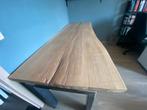 Zelfgemaakte eiken tafel (boomstamblad uit 1 stuk) met natuurlijke boomstamrand met metalen onderstel. Onderhoud: basin intensive