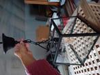 Eigentijdse luchter van zwart metaal en glazen wandjes. Zeer mooi met een sfeerlamp erin.