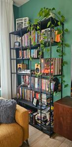 Wandrek (kan ook als scheidingsrek worden gebruikt) van het merk ethnicraft van zwart geborsteld metaal en teakhout. Hoogte: 205 cm breedte: 120 cm diepte: 40 cm gekocht in 2022 bij morres. Ik doe het