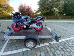 🚀 te huur: hydraulisch zakbare moto-aanhangwagen geen gedoe meer met oprijplaten! Deze aanhangwagen zakt hydraulisch volledig tot