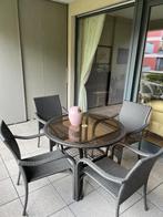 Salon de jardin, ideal aussi pour terrasse ou balcon car pas trop large (table 102 cm de diametre). Bon état. 4 Chaisses confortab