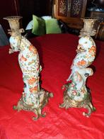 Paire de bougeoirs en porcelaine et bronze, décorés de motifs floraux colorés. Plutôt rare pour les deux dans ce bel état. Fin xxe