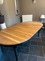 Zeer mooie massief naturel eiken tafel met zwarte poten diameter 120 m en kan verlengd worden tot 220 m behandeld met 2k tegen nat