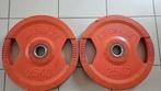 2x25kg nieuwprijs €280 hier aan €2,5 de kg : €125 professionele gym schijven met een diameter gat van 50mm ook met handige handvaten die recht over elkaar staan, wat veel beter aanvoelt