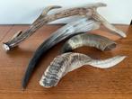 In zeer mooie staat. Bestaande uit 1 stang van een hertengewei, lengte ongeveer 50 cm; 1 koeienhoorn lengte ongeveer 31 cm; 1 lang