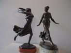 Auguste puttemans (1866-1922) brussel-elsene art nouveau paar bronzen beelden, dynamische composities van danseressen. Gesigneerde antieke sculpturen, fontes d'éditions anciennes naar de figuur va
