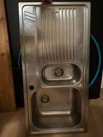 Franke anderhalve spoelbak inox met afdruipkant langs rechts met aansluitingen, zonder kraan met klein deukje, te zien op foto