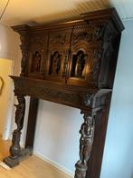 Te koop unieke grote schouwmantel met zeer fijn uitgesneden details van hout structuur. Mag weg met spijt in ons hart maar wegens kleiner wonen kunnen we dit niet meer plaatsen qua omvang en hoogte. H