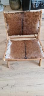 Prachtige stoel van hout en echt koeienhuid, 65 cm breed en 78 cm lang. Moet verkocht worden omdat hij niet in mijn nieuwe, kleinere appartement past. Gebruikt, maar in perfecte staat. Alleen ophalen.