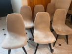 6 stoelen met zachte velours stoelenhoezen, op maat gemaakt. Handig afneembaar met rekker en uitwasbaar. De stoelen zijn van nepleer en daar ging de bovenste kleur wat af. Vandaar dat we er stoelenhoe