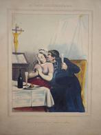 Ironische antiklerikale prent, getiteld "maximes ecclesiastiques"(kerkelijke stelregels) satirische scène met een geestelijke in compromitterende situatie, kritiek op de hypocrisie van de ge