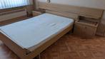 Bed van 1m40 met hoofdbord en nachtkastjes, 2 lattenbodems van 70cm, matras met 2 matrasbeschermers en commode. Uit hetzelfde hout