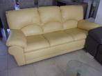 Divan 3 places en cuir véritable jaune, couleur qui revient à la mode; bon état général sauf coussin du milieu abimé, voir photos; on y est encore trè