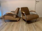 2 identieke jan des bouvrie fauteuils uitgevoerd in cappuccino kleurig alcantara de bekleding is bevlekt en is hier en daar licht