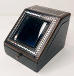 Ancienne boîte/ porte-montre à gousset incrustation de nacre et fermeture en laiton mesures 6cm sur 6,5cm envoi soigné