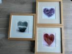 Trois cadres en bois clair avec passe-partout contenant des images d'une pierre en forme de cœur, d'un cœur fait de feuilles et d'un cœur