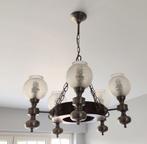 Lustre avec une poutre en chêne massif, des porte-lampes et des ornements en étain, des abat-jour en verre gravé. En bon état et e