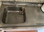 Un évier, avec un bac et un égouttoir en acier inoxydable de 1 m de long. Toujours en bon état, peut certainement encore être utilisé. Ce n'est pas un grand évier, mais il peut être utilisé comme