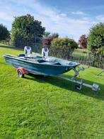 Barque ultra stable de 4,05m de long,1,60m de large 0,50m de haut. Charge utile 450kg. Motorisation max. 10Cv arbre court. Bouchon de nable.2 Dames de nage. 2 Rames. 1 Davier coinceur. 5 Points d'