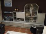 1. Vitrinekast. Stapelbare elementen, dus andere combinaties mogelijk. In goede staat. Kleur: parelmoergrijs. Afmetingen: l 3m20,
