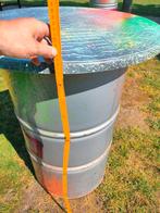 Statafel op basis van 2 tonnen met houten verbindingsblad. Zeer stevig