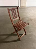 Set van 4 smalle en 2 iets grotere houten tuinstoelen. Voor formaten: zie foto’s van de uitgeklapte stoelen. Mits een laagje verni