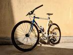 Fixie project fiets, afgewerkt in augustus 2025. De fiets werd zorgvuldig gedemonteerd en terug in elkaar gezet met nieuwe of zo goed als nieuwe onderdelen. Het kader werd volledig geschuurd, roestvr