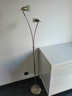 Staande lamp in geborsteld metaal met twee buigzame armen en matglazen lampenkappen