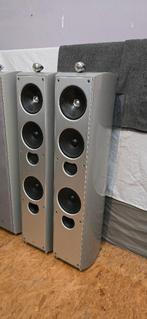 Een set kef xq5 in metalic silver. Versie met de reference tweeter. De kast van één van de luidsprekers heeft een klein deukje in de bovenrand. Vanop afstand moeilijk te zien, maar het is er wel (zie