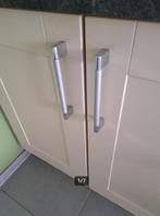 Te koop aangeboden: 16 stuks handgrepen messing/zilver met bijhorende boutjes lengte buitenkant: 20 cm afstand tussen de gaten/montage=: 16 cm zie fot