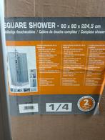 Volledige douchecabine 80x80cm bestaande uit: -douchebak in acryl 80x80cm met afvoergarnituur 90mm -2 achterwanden in wit gesatine