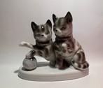 Figurine ancienne représentant deux chats jouant avec une pelote, en porcelaine fine allemande. Pièce estampillée en vert carl scheidig – gräfenthal, marque utilisée entre 1906 et 1935, attestant de s